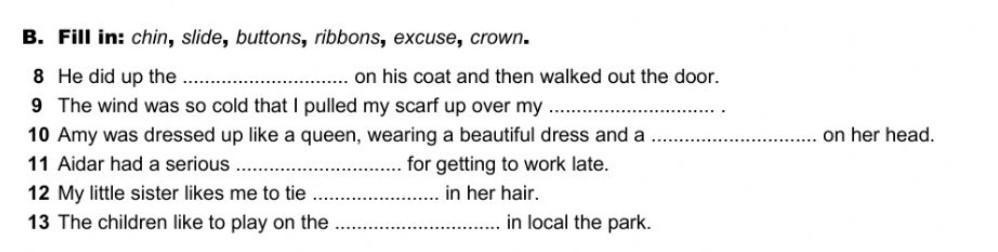 B. Fill in: chin, slide, buttons, ribbons, excuse, crown. 8 He did up the on his coat and then walked out the door. 9 The wind was so cold that I pulled my scarf up over my 10 Amy was dressed up like a queen, wearing a beautiful dress and a 11 Aidar had a serious for getting to work late. 12 My little sister likes me to tie in her hair. 13 The children like to play on the in local the park. on her head.