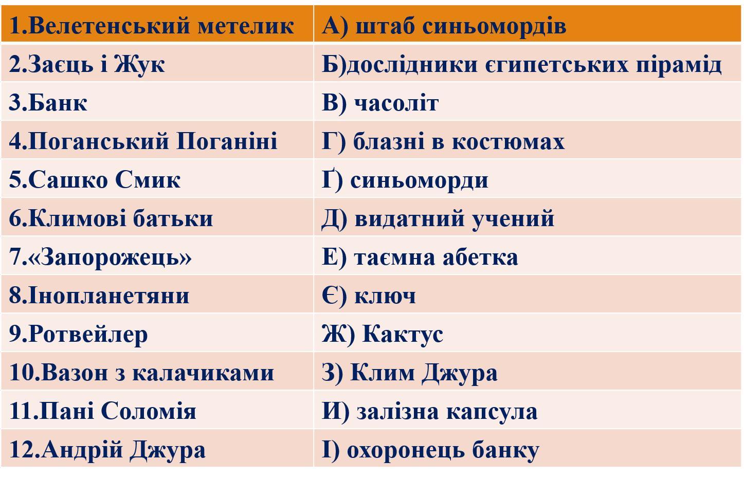 1). И; 2). Г; 3). А; 4). З; 5). Ж; 6). Б; 7). В; 8). Ґ; 9). І ; 10). Є ; 11). Д; 12). Е.