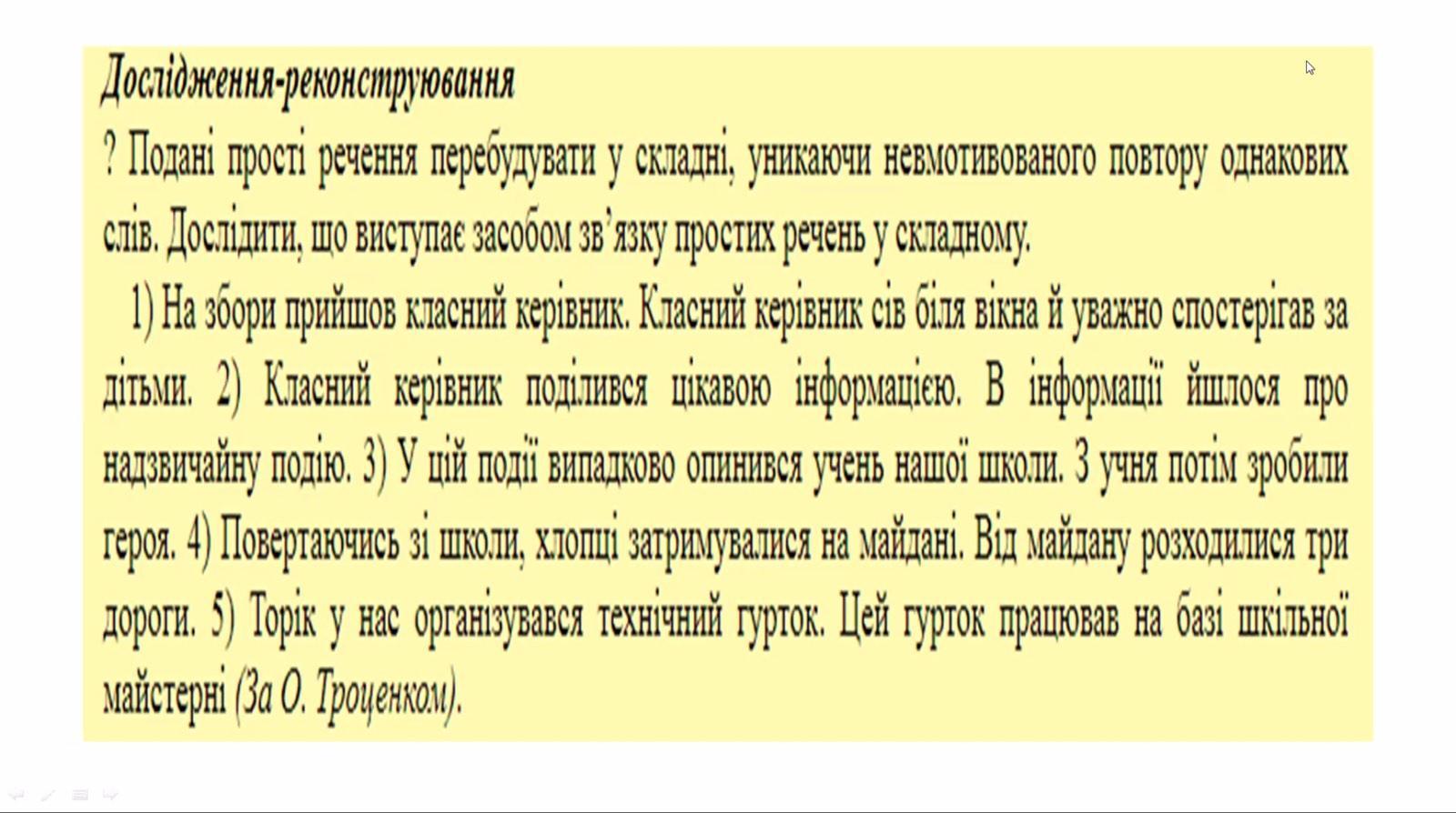 1) На збори прийшов суворий керівник. Він сів біля холодного вікна і спостерігав за веселими дітьми. 2) Він поділився із колегами важливою та цікавою інформацією. Йшлося про надзвичайну подію! 3) Абсолютно випадково учень опинився у розмові.А потім з нього зробили величайшого героя!!4) а повертаючись зі школи хлопці заходили на майдан. Від нього йшли чудернацькі три дороги.5)Потім організувся технічний цікавий гурток.Цей чудовий гурток працював на надзвичайній базі шкільної майстерні
