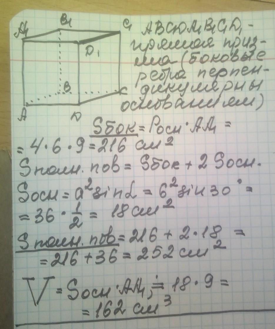 Основанием прямой призмы является ромб со стороной 6 см и острым углом 30 градусов. Найдите площадь боковой поверхности, площадь поверхности и объём призмы, если её боковое ребро равно 9 см.