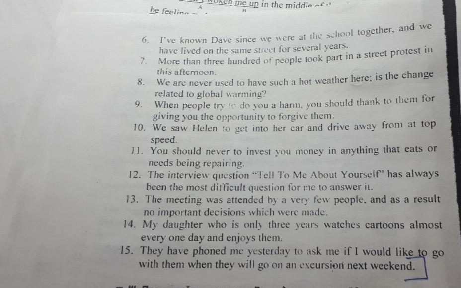 Здесь ошибки в предлогах (tell me, но не to me) артиклях - употребляют там, где они не нужны (перед словом weather стоит артикль, а он там не может употребляться), в №15, например, берут перфектное время с наречием времени yesterday, которое является указателем простого прошедшего времени. Употребляются лишние слова, создающие тавтологию, или не соответствуют смыслу предложения, как слово very(a few) или never, в предложении №8.