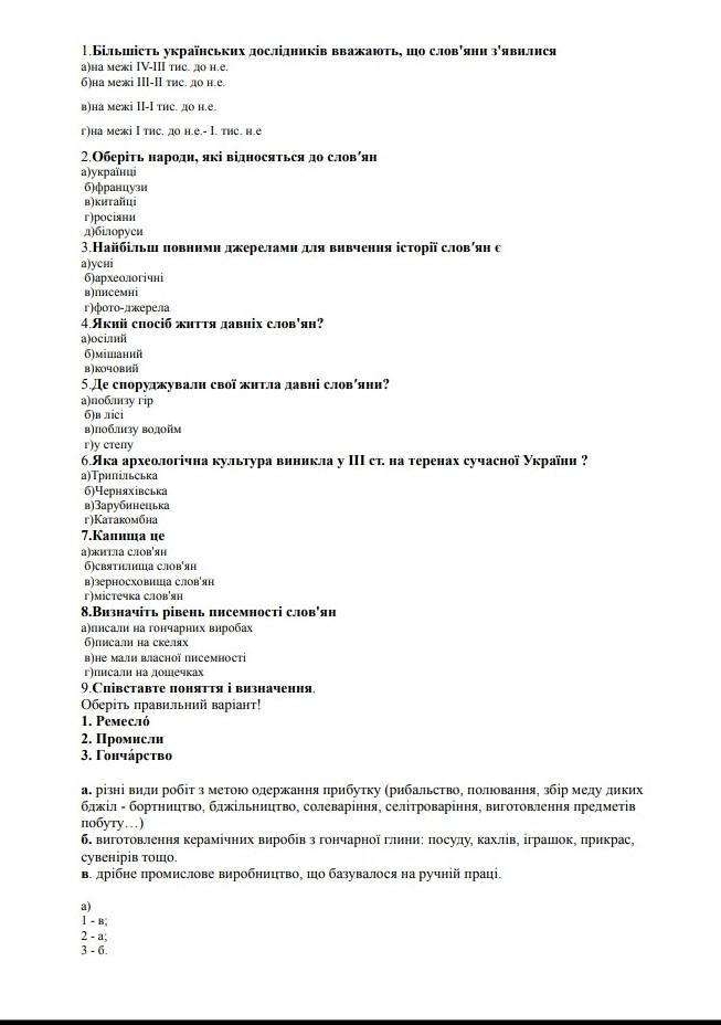 1. Більшість українських дослідників вважають, що слов'яни з'явилися а)на межі IV-III тис. до н.е. б)на межі ІІ-ІІ тис. до н.е. в)на межі ІІ- тис. до н.е. г)на межі І тис. до н.е.- 1. тис. н.е 2.Оберіть народи, які відносяться до слов'ян а)українці б)французи вјкитайці г)росіяни д)білоруси 3.Найбільш повними джерелами для вивчення історії слов'ян є а)усні бархеологічні в)писемні г)фото-джерела 4. Який спосіб життя давніх слов'ян? а)осілий б)мішаний в) кочовий 5.Де споруджували свої житла давні слов'яни? а)поблизу гір б)в лісі в)поблизу водойм г)у степу 6. Яка археологічна культура виникла у III ст. на теренах сучасної України ? а)Трипільська б)Черняхівська в)Зарубинецька г)Катакомбна 7.Капища це ажитла слов'ян б)святилища слов'ян в) зерносховища слов'ян г) містечка слов'ян 8.Визначіть рівень писемності слов'ян а)писали на гончарних виробах б)писали на скелях в)не мали власної писемності г)писали на дощечках 9.Співставте поняття і визначення, Оберіть правильний варіант! 1. Ремесло 2. Промисли 3. Гончарство a. різні види робіт з метою одержання прибутку (рибальство, полювання, збір меду диких бджіл - бортництво, бджільництво, солеваріння, селітроваріння, виготовлення предметів побуту...) б. виготовлення керамічних виробів з гончарної глини: посуду, кахлів, іграшок, прикрас, сувенірів тощо. в. дрібне промислове виробництво, що базувалося на ручній праці. а) 1 - В 2-а, 3-6. помогите пожалуйста ДАЮ 30 БАЛОВ