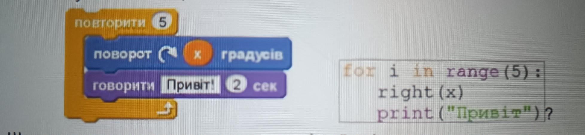 Спочатку буде поворот на Х, потім буде виведене слово "Привіт". І все це повториться 5 разів.