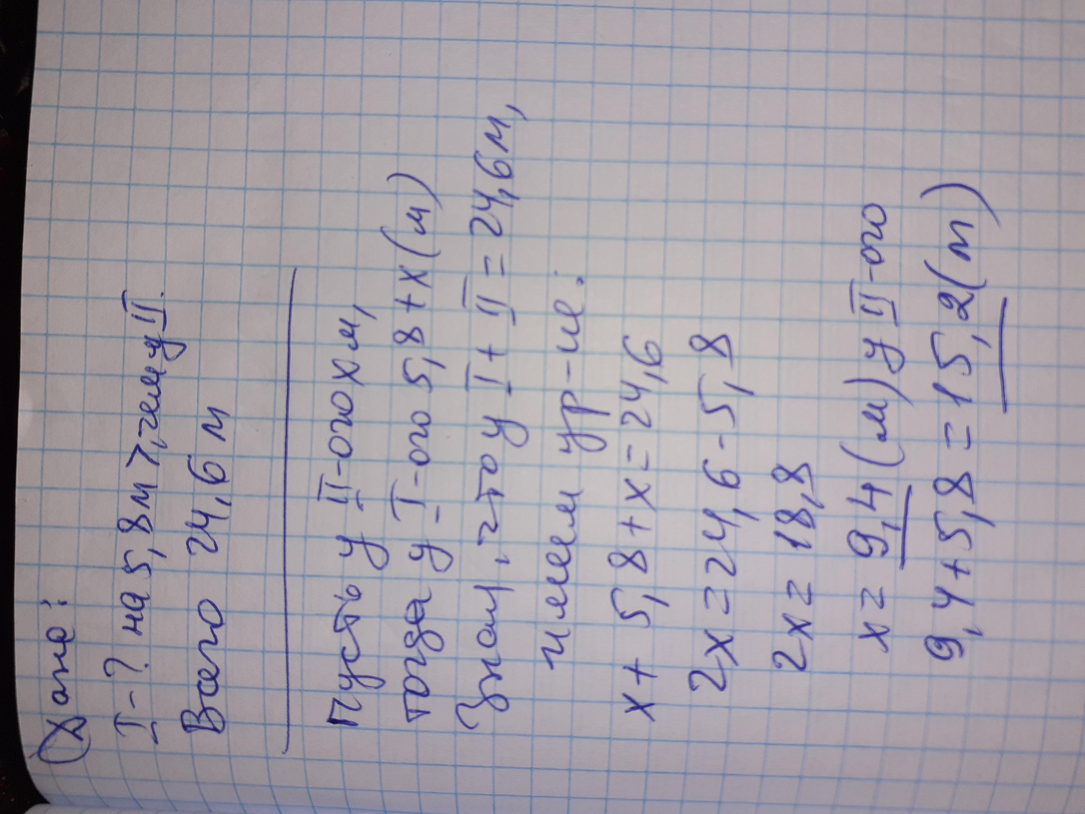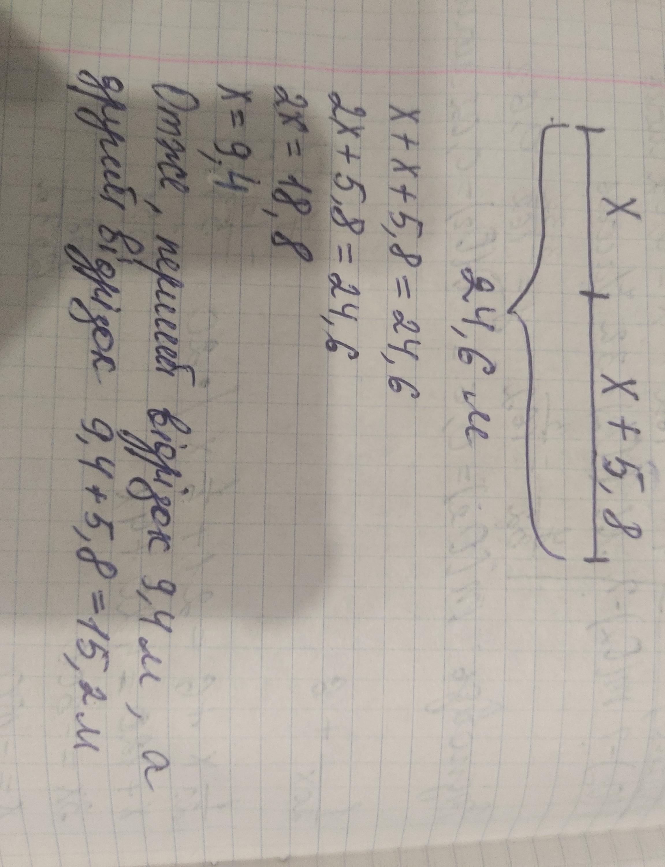 У двох відрізка 24,6 м шовку. У першому відрізку шовку 5,8 м більше нвж у другому. Скільки метрів шовку в кожному відрізку?