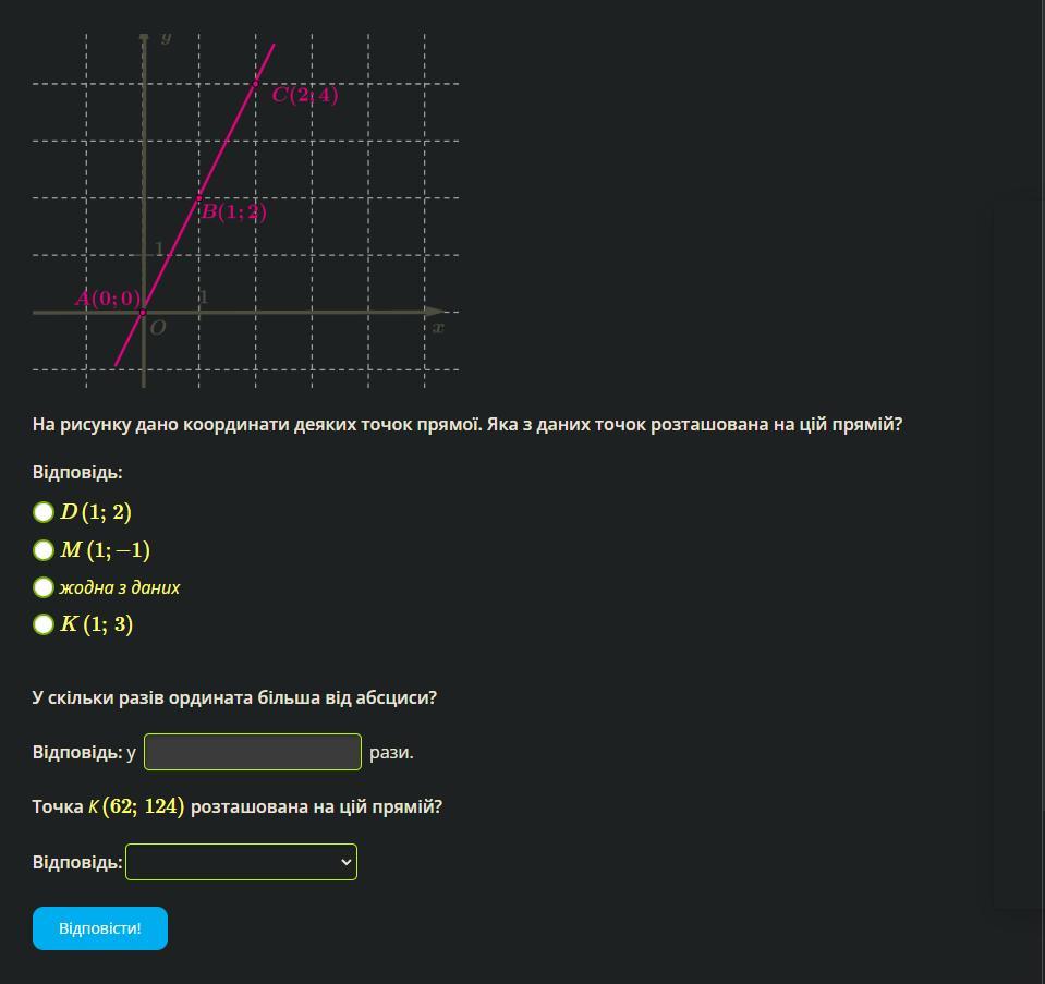 2. у 2 рази (можна просто поділити ординату на абцису (4/2 = 2, 2/1 = 2)