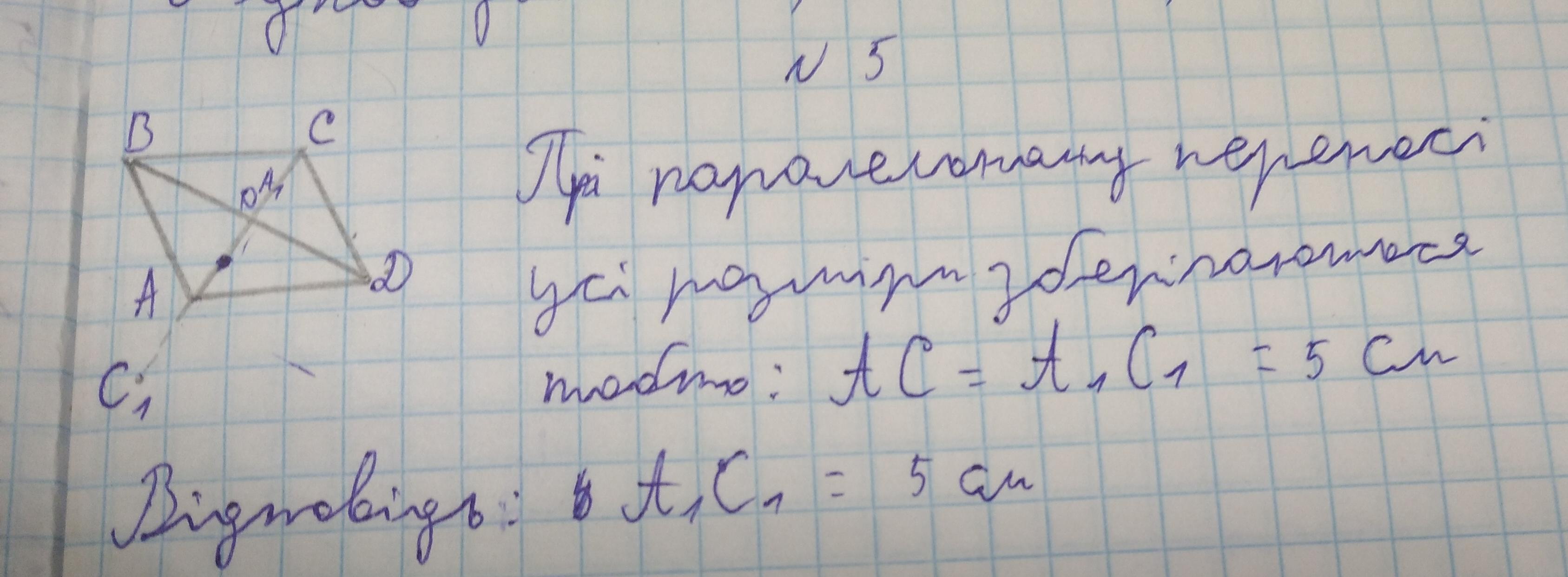 5°. 0 - точка перетину діагоналей ромба АBCD. При паралельному пере несеннi точка А відображається на точку О, точка С - на С1. Знайдіть АС,, якщо АС = 5 см.