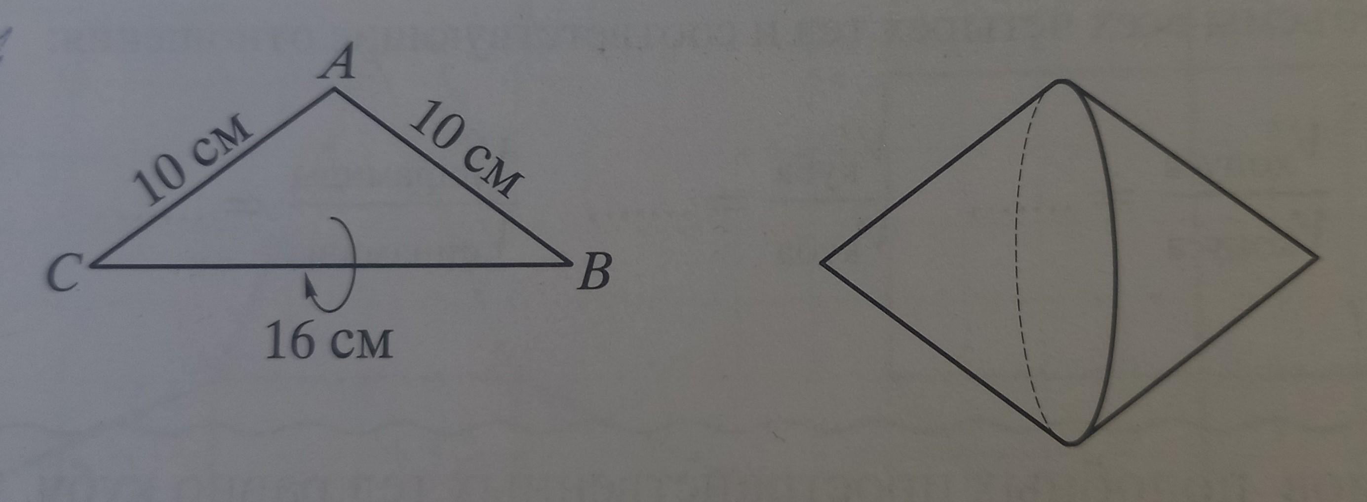 Равнобедренный треугольник АВС ( АВ=АС=10см, ВС=16 см). вращается вокруг основания.