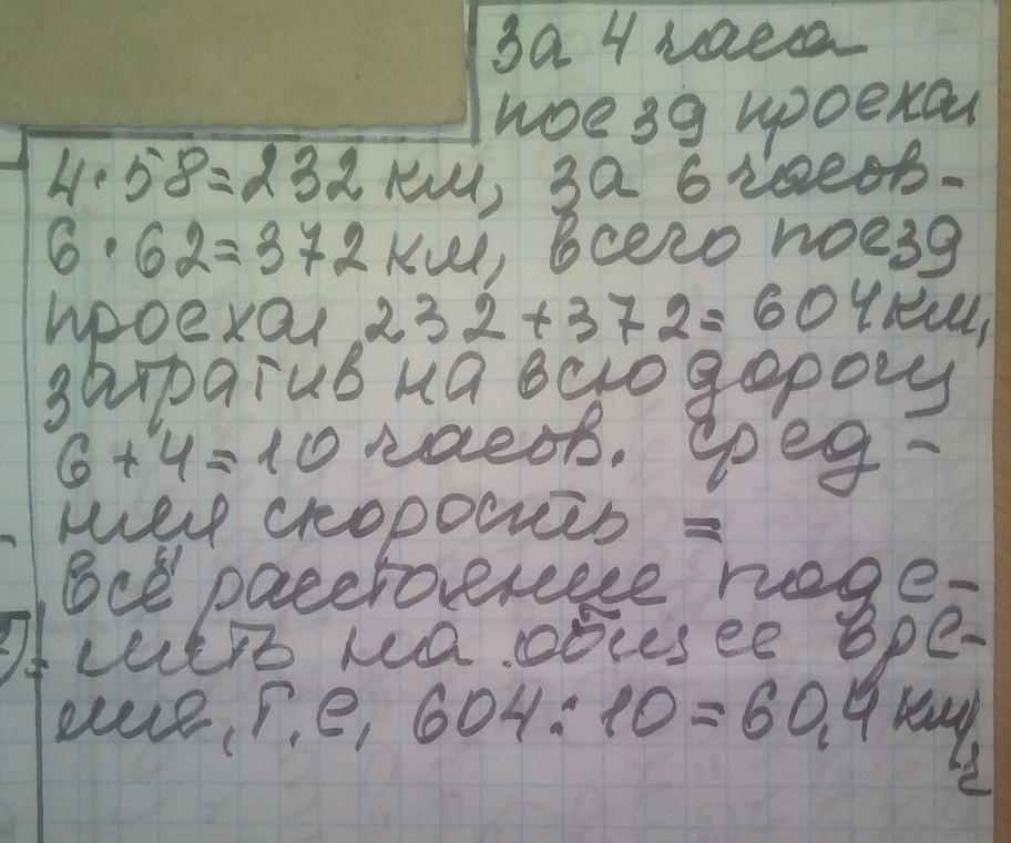 Поїзд рухався 6 год з швидкістю 62 км/год і 4 год з швидкістю 58 км/год Знайти середню швидкість поїзда