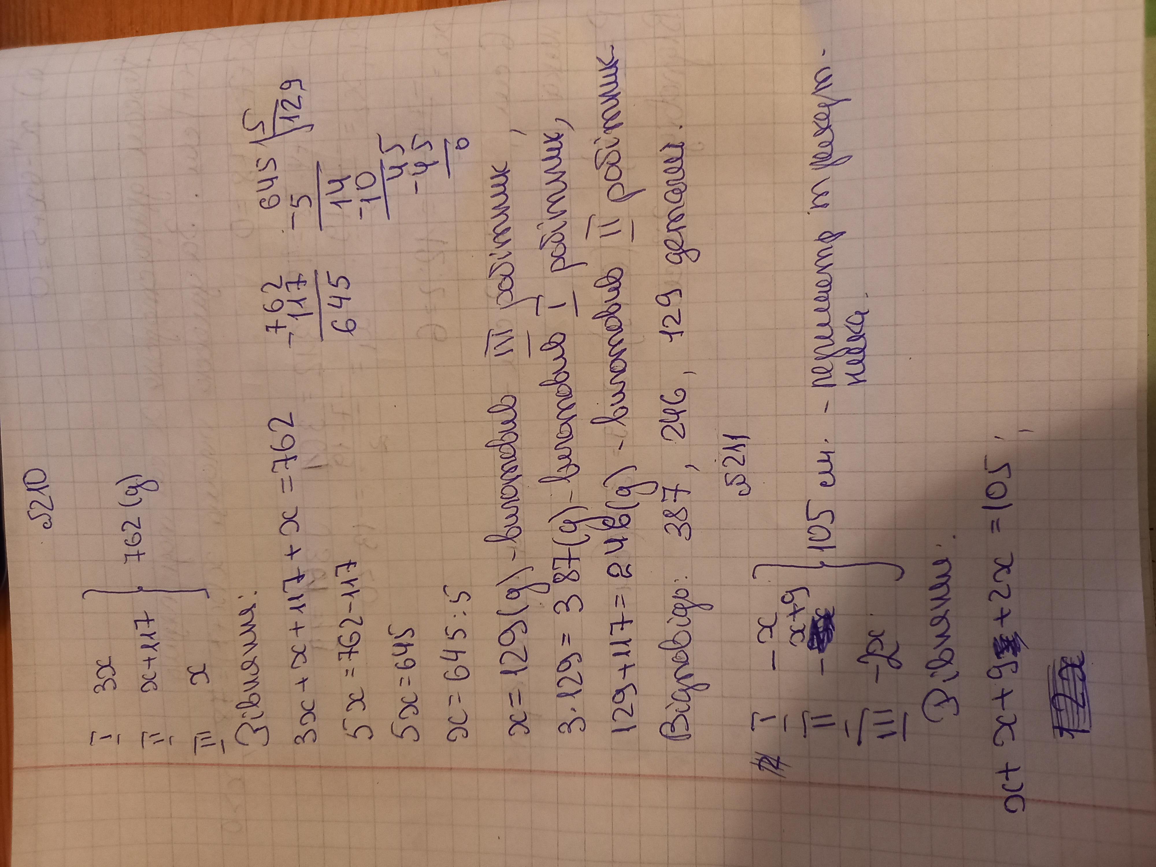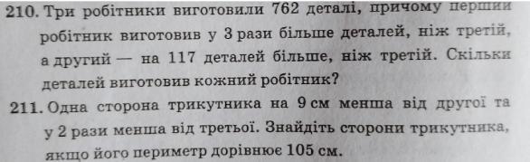 пусть x деталей изготовил 3 рабочий, тогда 3*x деталей изготовил 1 рабочий, а 2 рабочий изготовил x+117 деталей. Всего они изготовили 762.