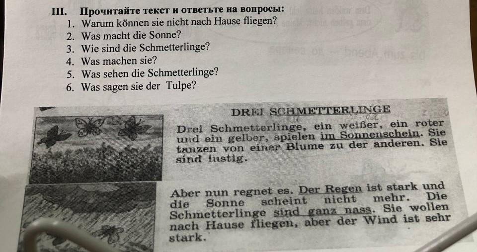 1. В первом тектсе: Die Schmetterlinge tanzen, aber sie sind nass.