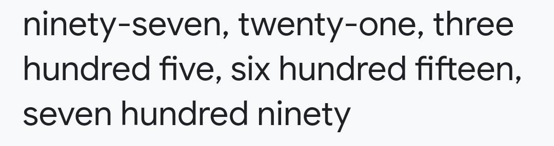 ninety-seven, twenty-nine, three hundred five, six hundred fifteen, seven hundred nineteen.