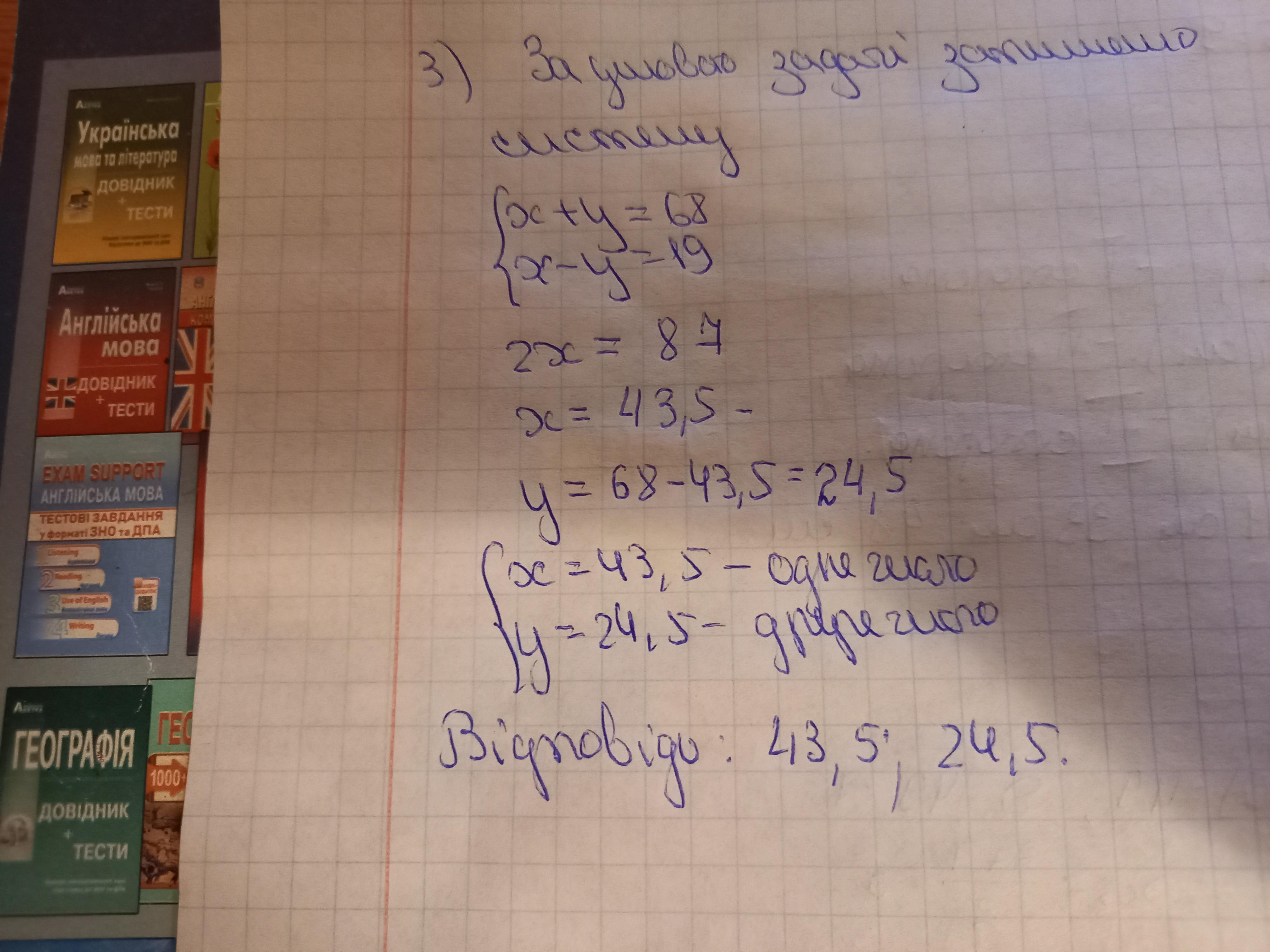 Знайдіть два числа, якщо їхня сума дорівнює 68, а різниця дорівнює 19