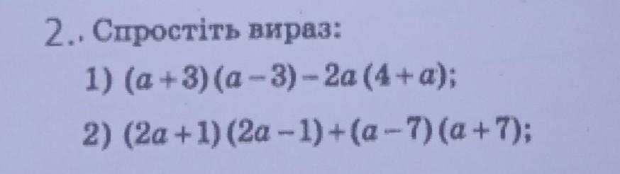\displaystyle 1)(a+3)(a-3)-2a(4+a)=a^2-9-8a-2a^2=-a^2-9-8a=-a^2-8a-9\\\\2)(2a+1)(2a-1)+(a-7)(a+7)=4a^2-1+a^2-49=5a^2-50
