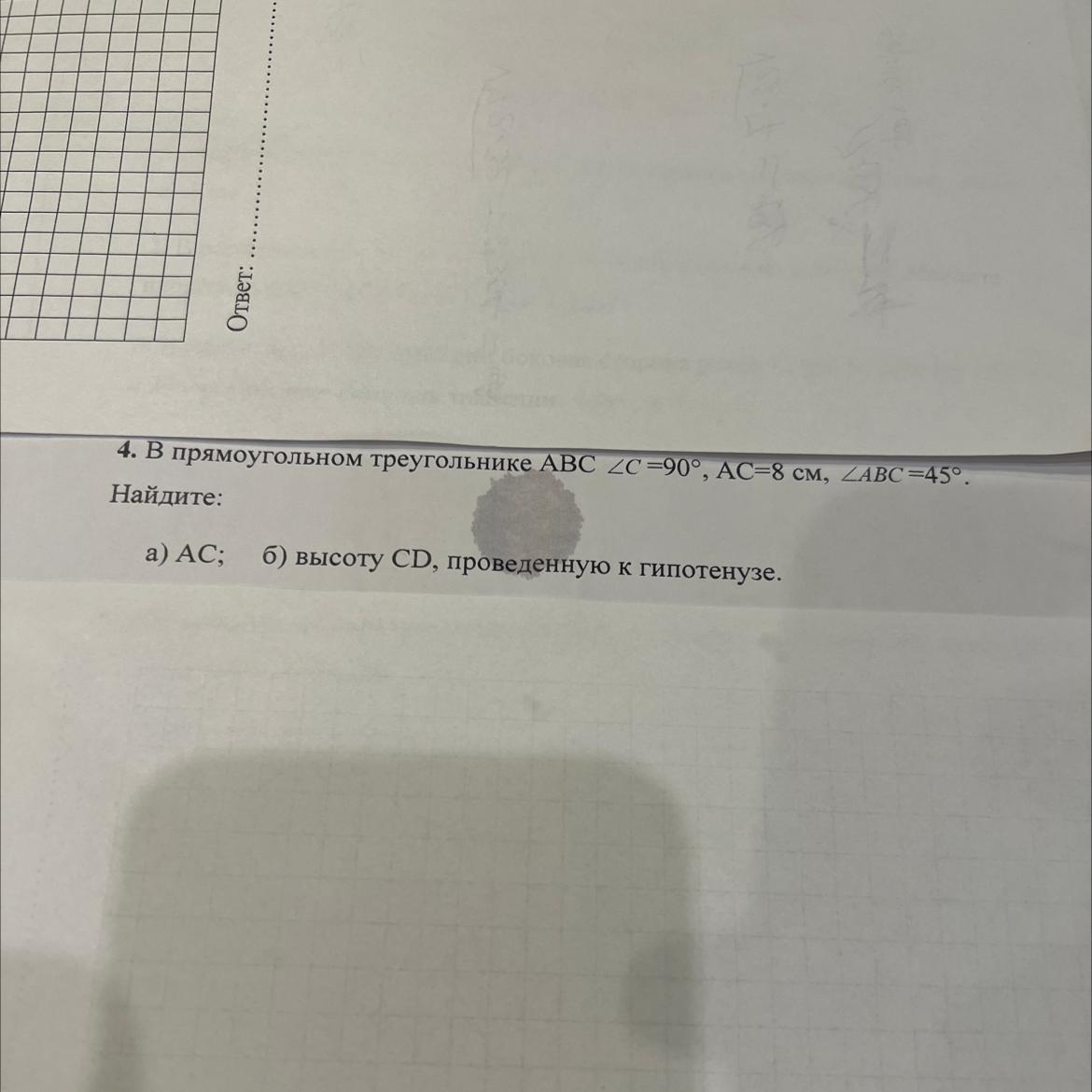 4. В прямоугольном треугольнике ABC 2C 90°, АС-8 см, ZABC -45°,
