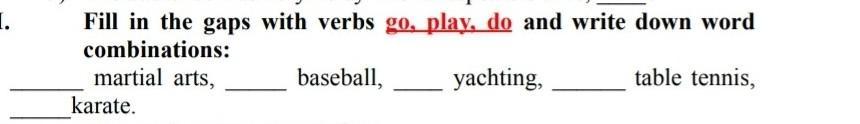 do martial arts, play baseball, go yachting, play table tennis, do caratecarateдолжно быть верно