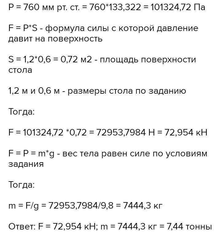 с какой силой воздух давит на крышку стола, длина размерами 120 х 60 см? чему равна масса тела, имеющего такой вес?