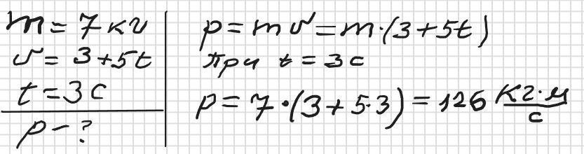 Тіло масою 7 кг рухається у відповідності рівнянню υ= 3 + 5t. Визначить, який імпульс набуває тіло через 3 с від початку руху та силу взаємодії?