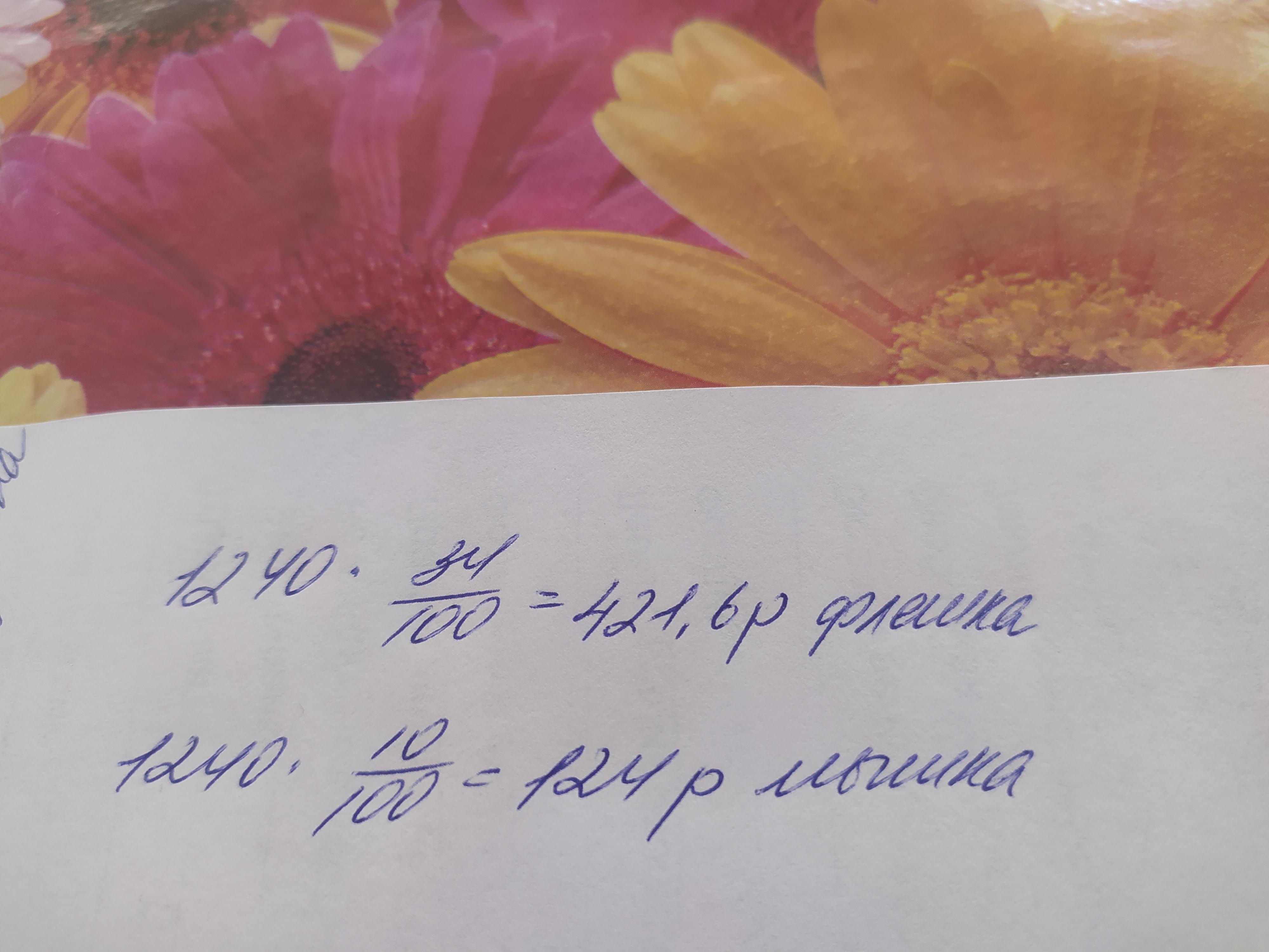 Сергей потратил в интернет магазине 1240руб. На покупку флеш-карты он потратил 34% этой суммы, а на покупку мыши - 10% этой суммы. Сколько руб стоили эти товары?