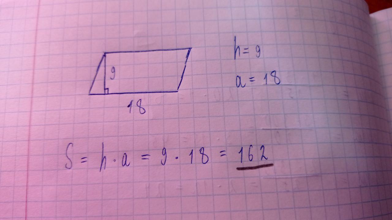 Знайти площу паралелограма сторона якого дорівнює 18 см, а висота проведена до неї 9 см.