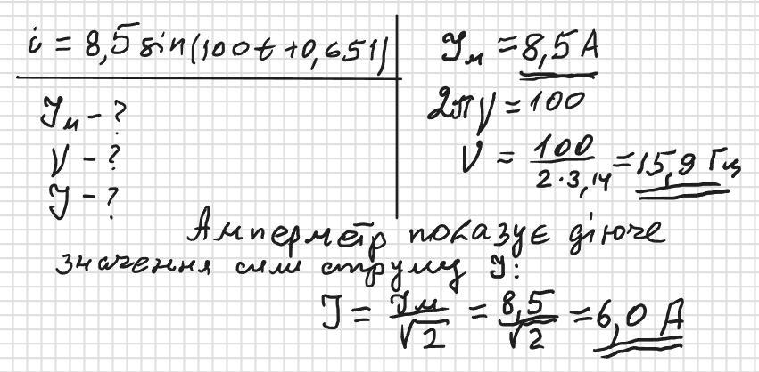 Сила струму на ділянці кола змінюється за законом і = 8,5 sin (100t+0,651) (А) Визначити амплітудне значення сили струму і частоту. Які покази амперметра, ввімкнутого в це коло?