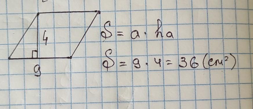 Знайдіть площу паралелограма, одна зі сторін якого дорівнює 9 см, а висота, проведена до цієї сторони, - 4 см.