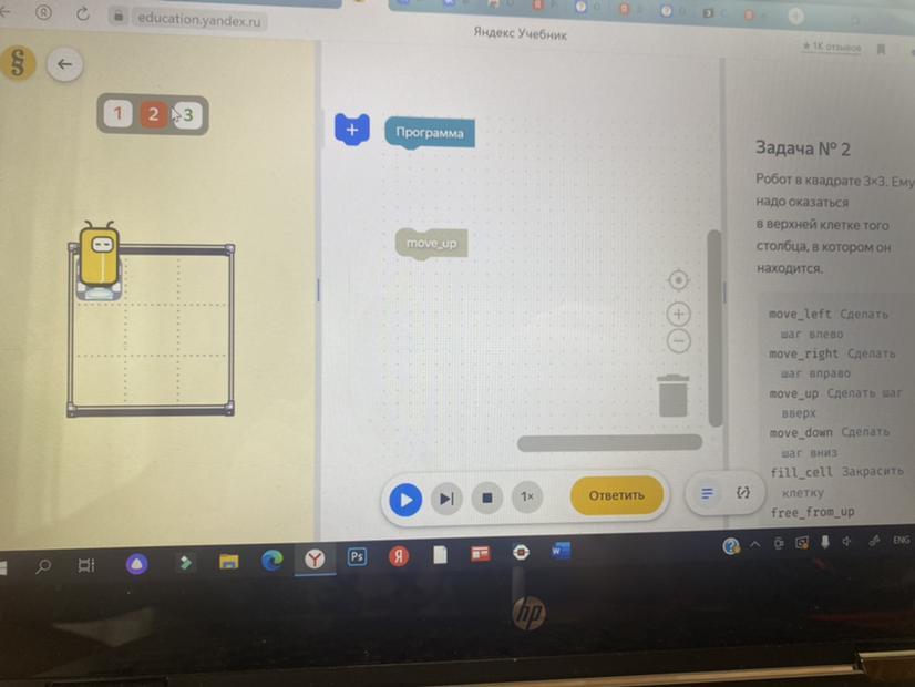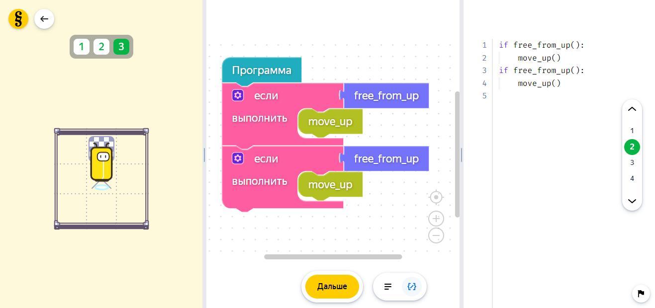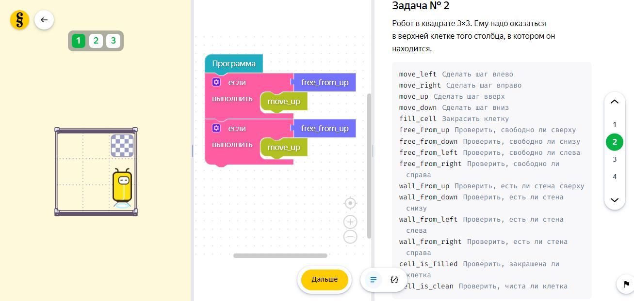 используем неполный условный оперетор (if free_from_up()), т.к. робот находится в квадрате 3×3, то в какой бы клетке столбца он не находился надо 2 раза проверить свободно ли сверху и, если условие (free_from_up()) истинно, то шагнуть вверх