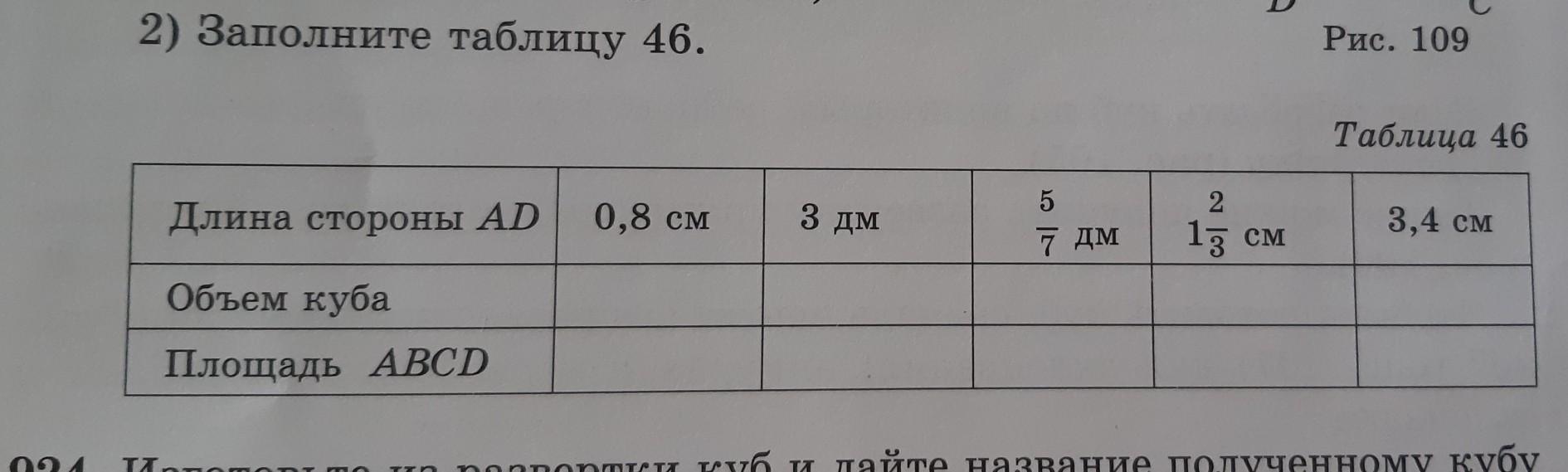 2) Заполните таблицу 46. Рис. 109 Таблица 46 5 2 Длина стороны AD 0,8 см 3 дм 3,4 см 7 дм 13 см Объем куба Площадь ABCD.!!! СРОЧНО!!!