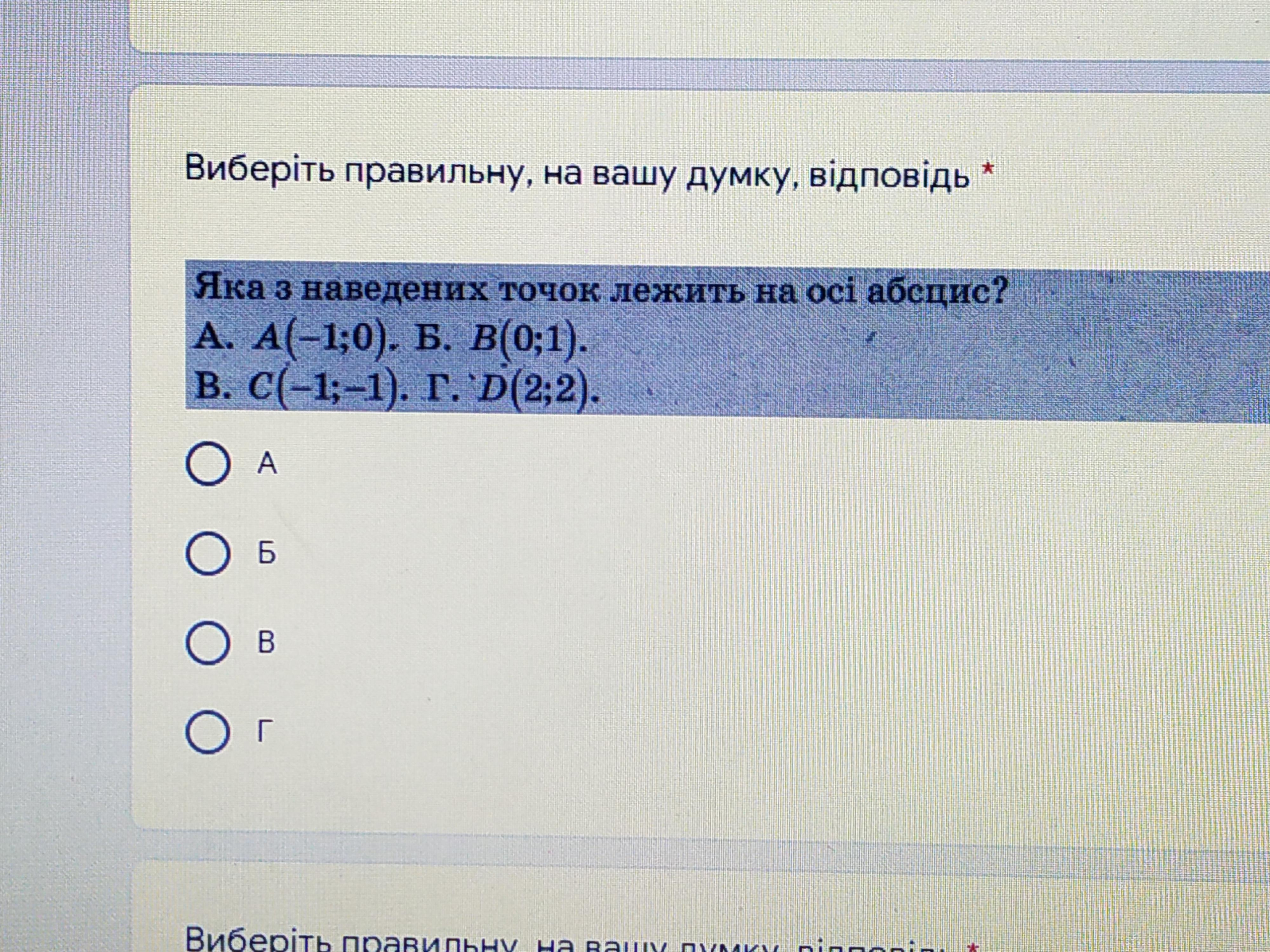 Б. В(0;1) Первой всегда стоит координата Х. Если точка лежит наоси абсцисс,тоее координата х=0