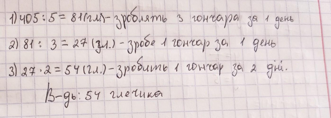 3 Гончара за 5 днів роботи виготовили 405 глечиків . Скільки глечиків виготовить 1 Гончар за 2 дні роботи?