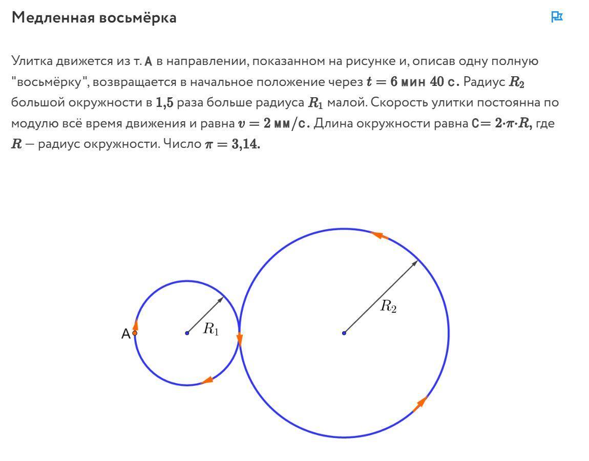 Радиус R2 большой окружности в 1,5 раза больше радиуса R1 малой. Скорость улитки постоянна по модулю всё время движения и равна v= 2мм/с.