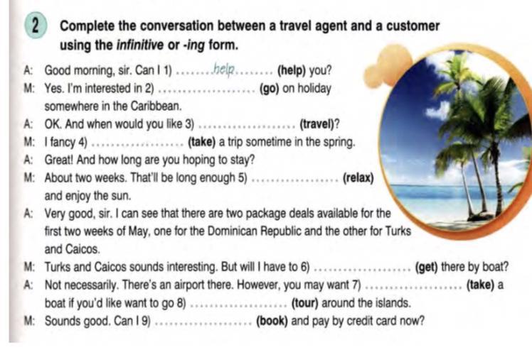 Complete a conversation between a travel agent and a client using the infinitive or -ing