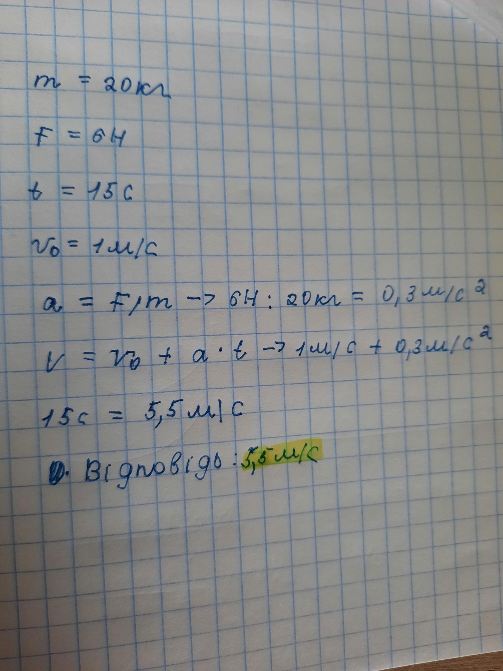 до тіла масою 20кг приклали постійну силу 6Н.Яку швидкість набуде тіло за 15с,якщо початкова шв руху довірнює 1м/с