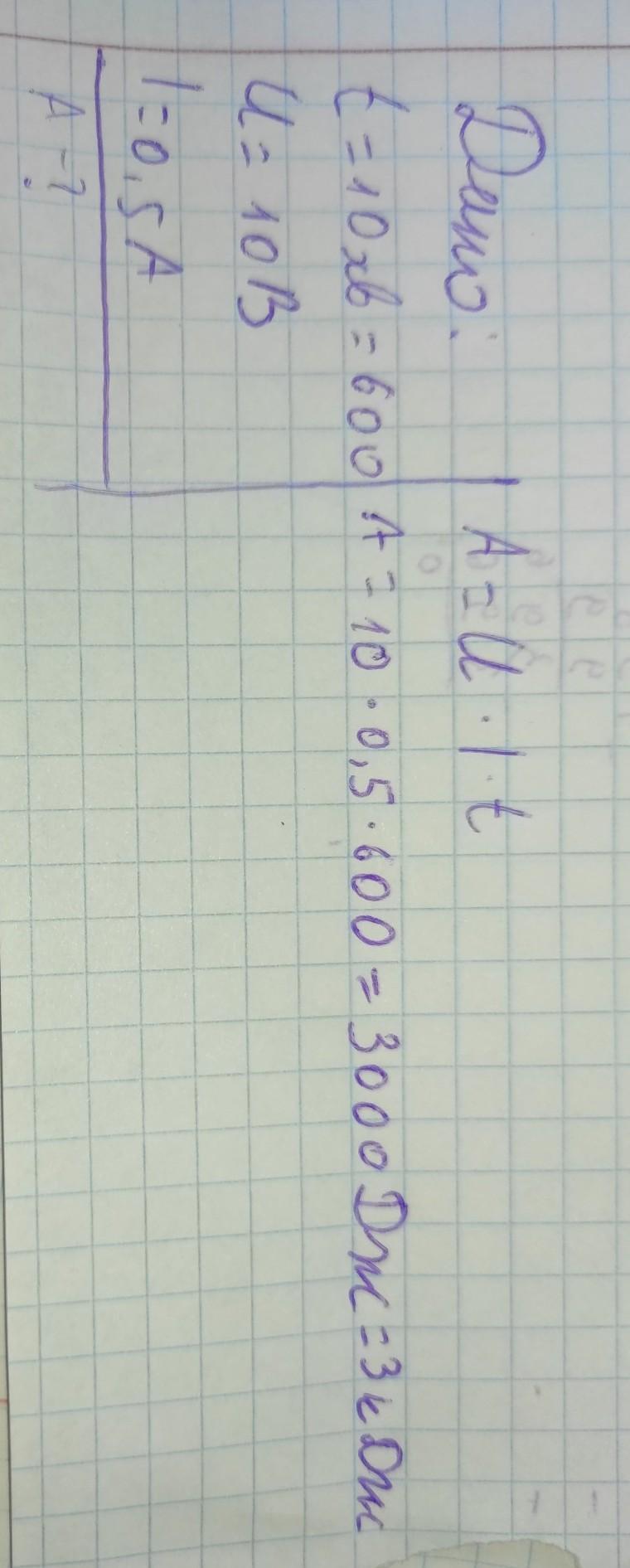 Обчисліть роботу електричного струму за 10 хв, якщо через електричний двигун проходив струм 0,5 А, а напруга на ньому була 10 В.
