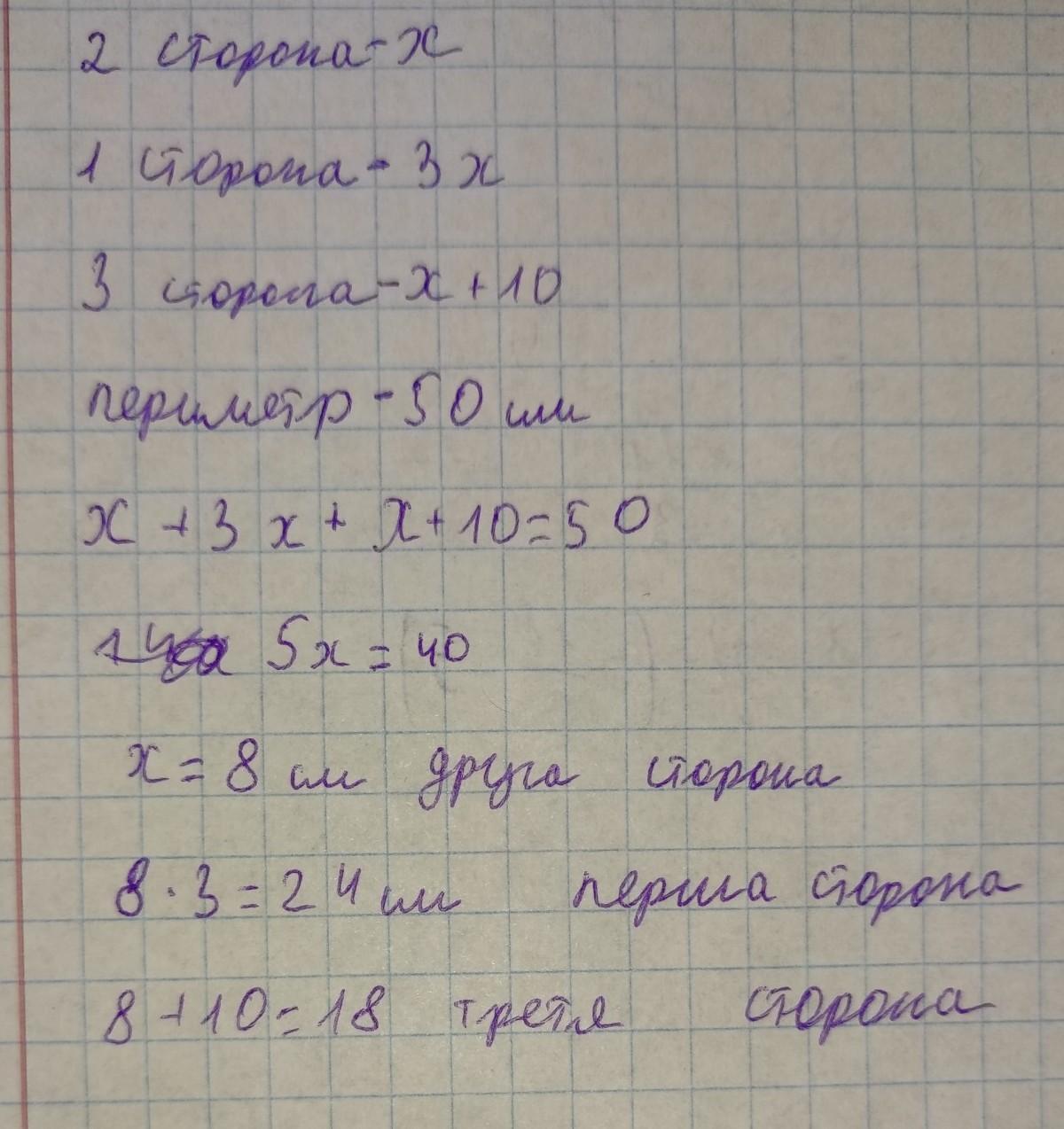 Периметр трикутника дорівнює 50 см. Перша його сторона в 3 рази довша за другу, а третя ̶ на 10 см довша за другу. Знайдіть довжину кожної сторони трикутника.
