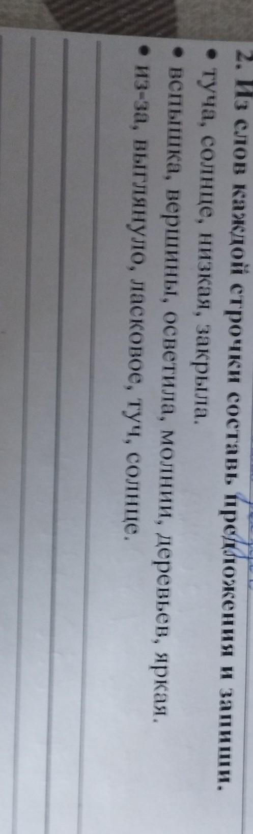 2. Из слов каждой строчки составь предложения и запиши. • туча, солнце, низкая, закрыла. • вспышка, вершины, осветила, молнии, деревьев, яркая. • Из-за, ВЫГЛЯнуло, ласковое, туч, солнце.