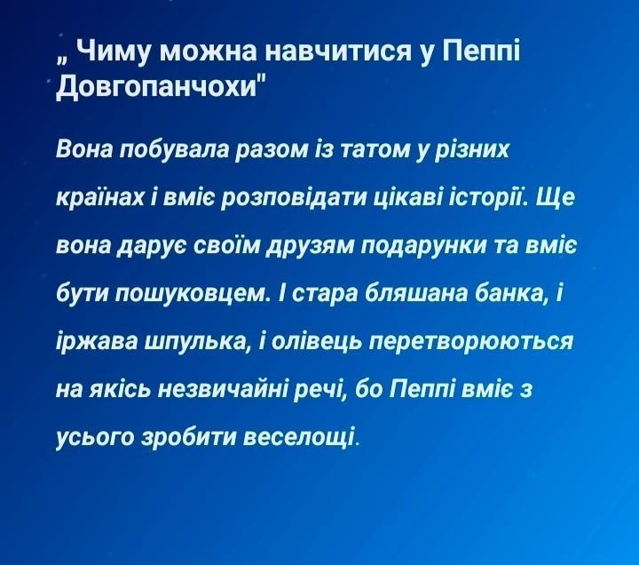 твір -"чого можна навчитися у Пеппі Довгопанчохи" подскажитее плизз (тому лучший ответ, подписка и 5 баллов