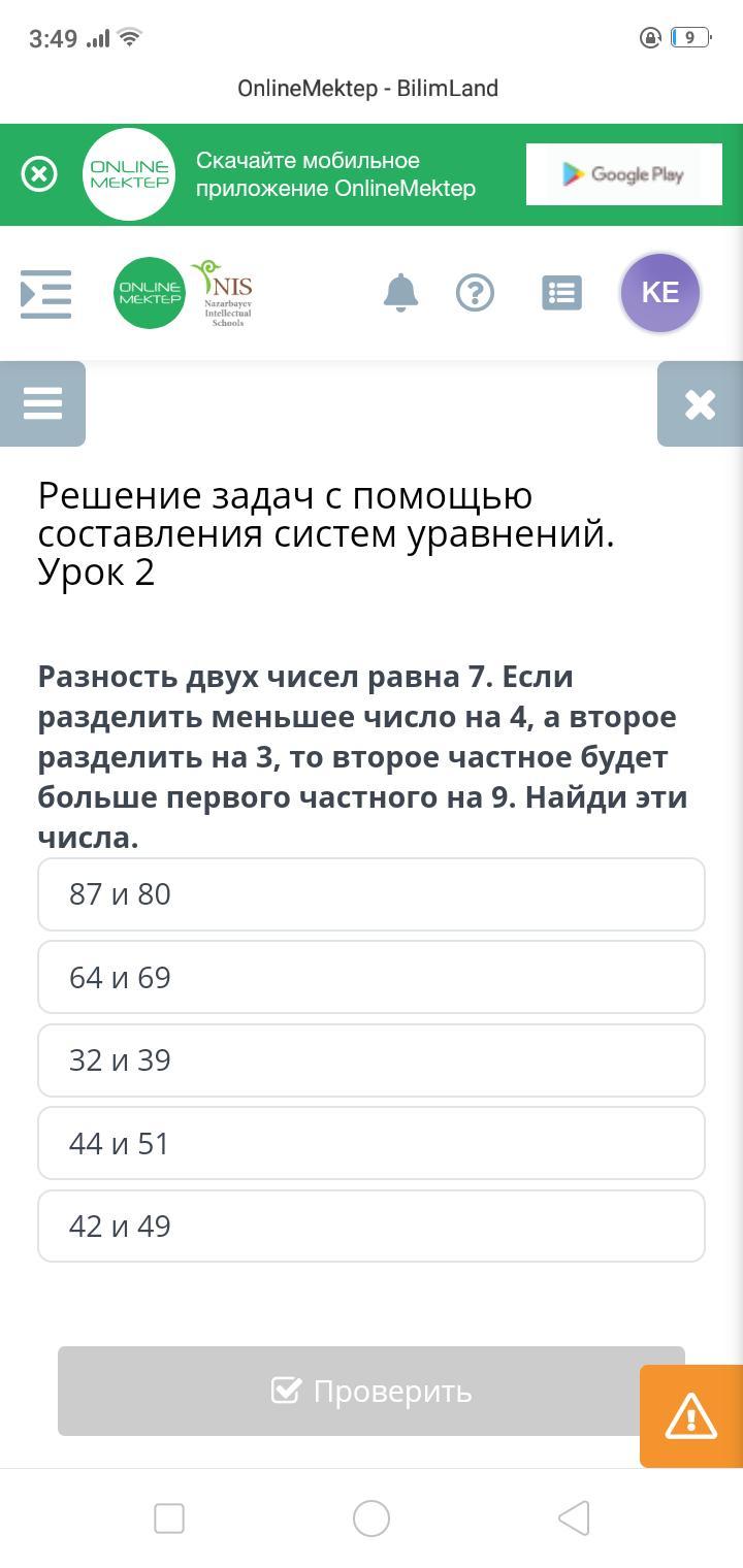 Разность двух чисел равна 7. Если разделить меньшее число на 4, а второе разделить на 3, то второе частное будет больше первого частного на 9. Найди эти числа.
