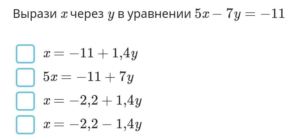 - Вырази с через ув уравнении 5х — 7y = — 11 х = — 11 + 1,4y 5х = -11 + 7y + х = — 2,2 + 1,4y x = -2,2 – 1,4y —