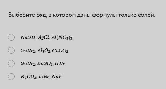 Ответ 4. Карбонат калия, бромид лития, фторид натрия.