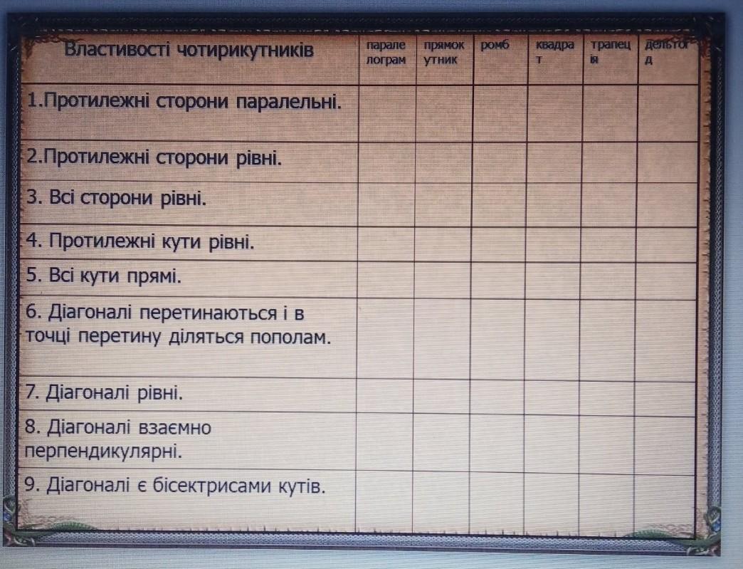 9. - - + + - ; у дельтоіда головна діаголь є бісектрисою кутів.