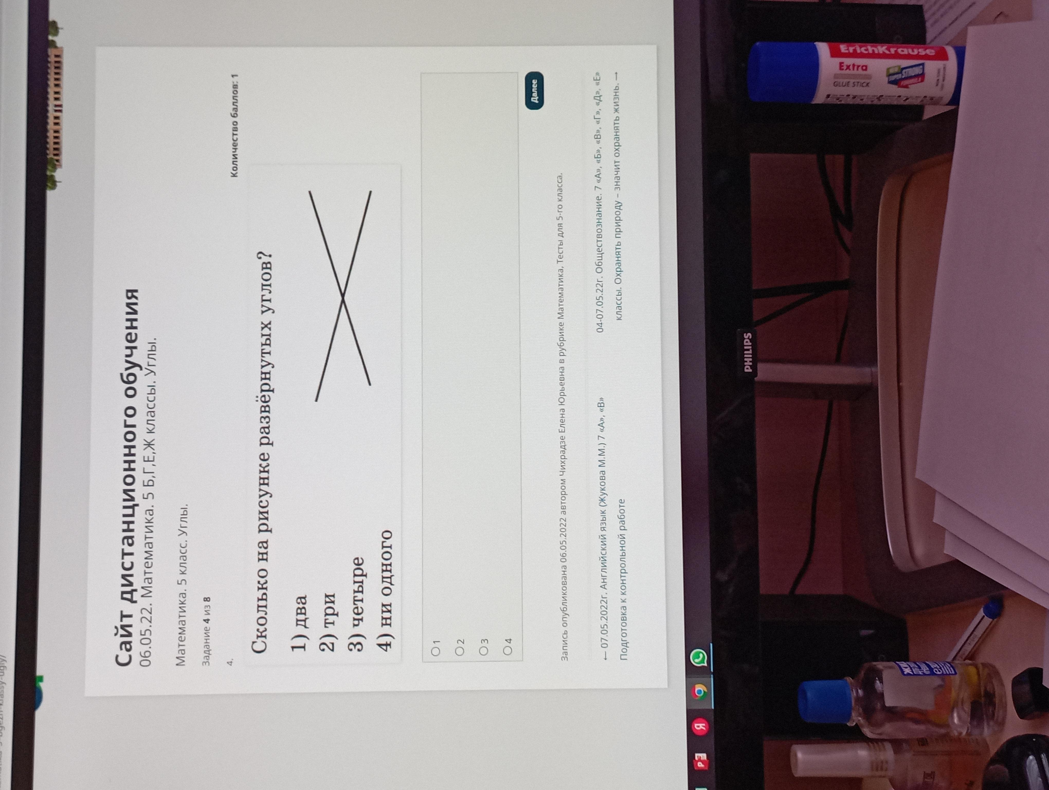На рисунке изображены 2 прямые, у каждой прямой по два развёрнутых угла ⇒ 2*2=4 угла.