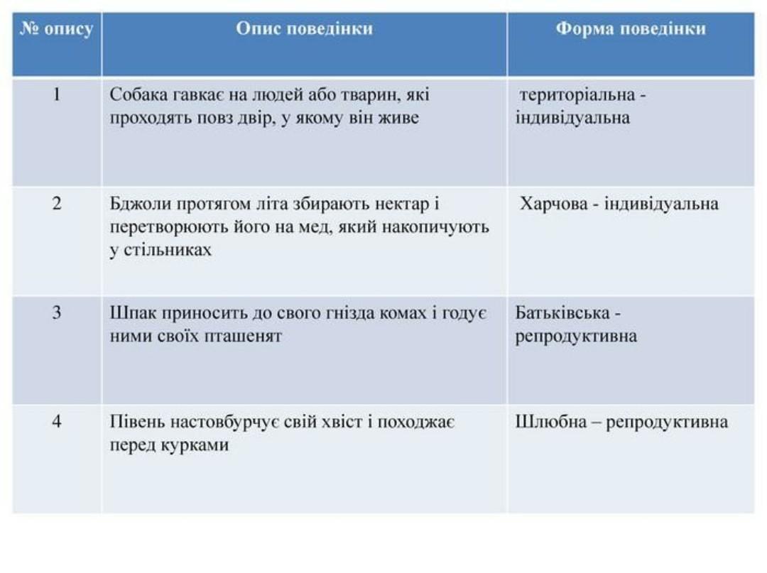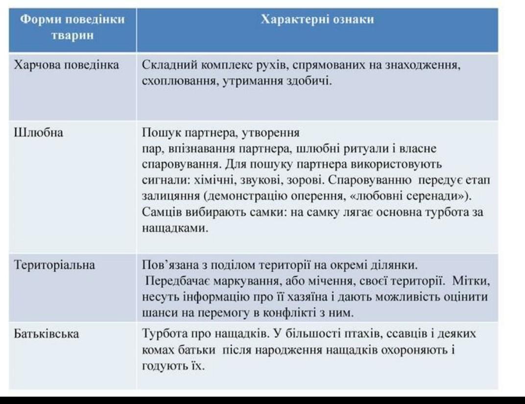 використовуючи матеріали підручника та інших джерел поясніть, які ознаки дозволяють впізнати різні форми поведінки тварин . відповідні ознаки впишіть у таблицю .