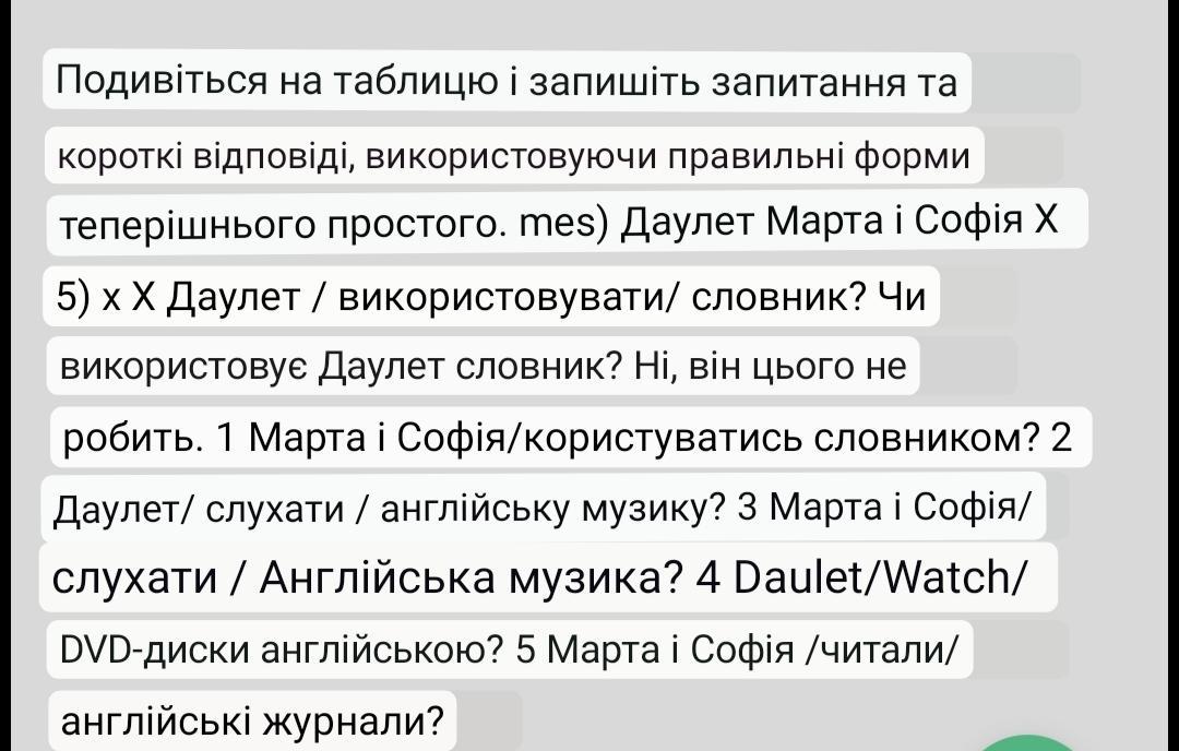 of Look at the table and write questions and short answers using the correct form of the present simple. mes) Daulet Marta and Sofia Х 5) х Х Daulet / use / a dictionary? Does Daulet use a dictionary? No, he doesn't. 1 Marta and Sofia / use a dictionary? 2 Daulet/ listen to / English music? 3 Marta and Sofia/ listen to / English music? 4 Daulet / watch / DVDs in English? 5 Marta and Sofia / read / English magazines?