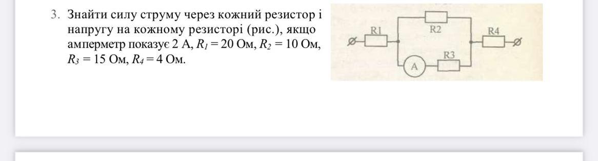 Знайти силу струму через кожний резистор і напругу на кожному резисторі (рис.), якщо амперметр показує 2 А, R1 = 20 Ом, R2 = 10 Ом, R3 =15Ом,R4 =4Ом.
