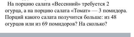 1) 48 : 2 = 24 (порции)- получится салата "Весенний"