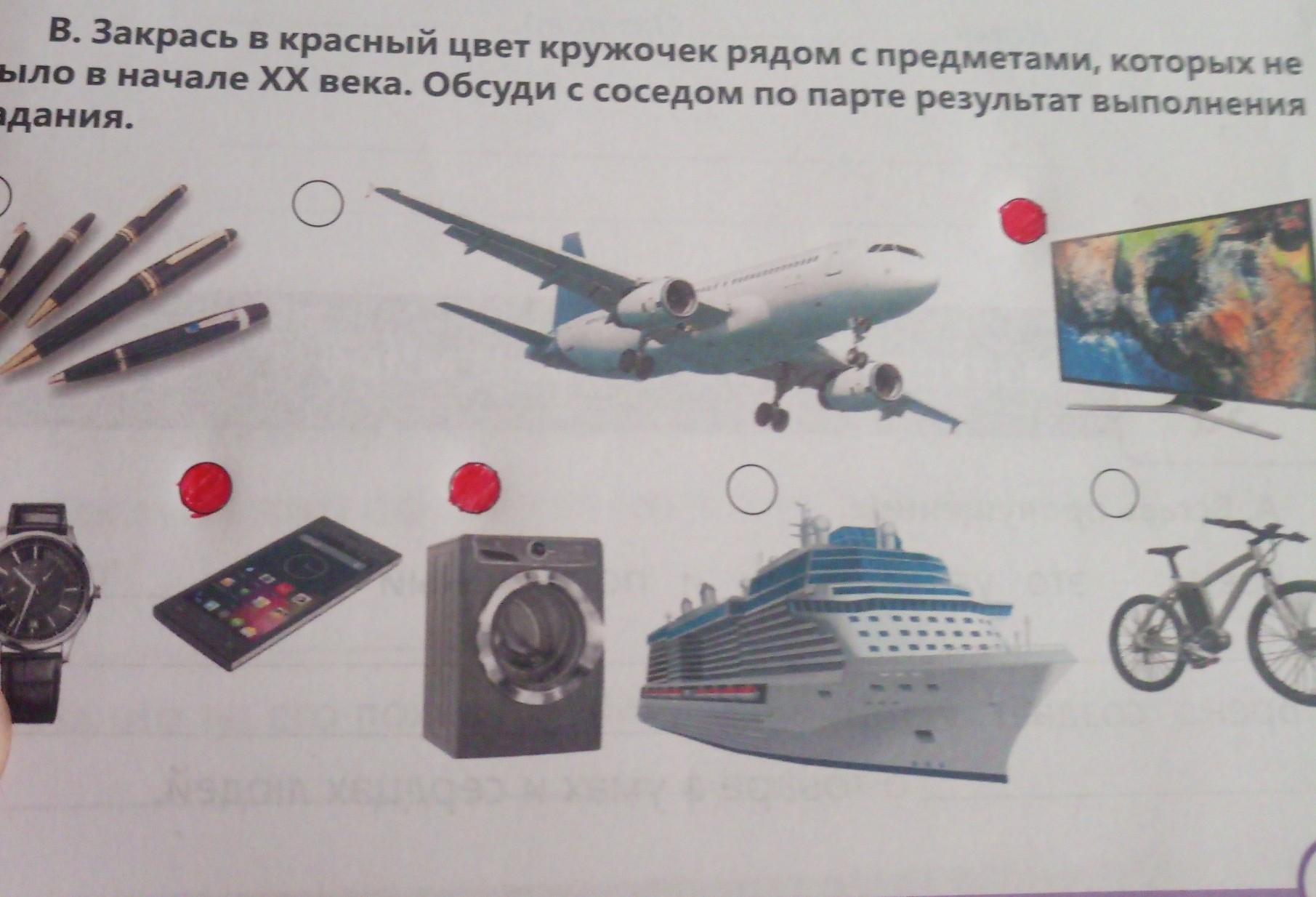 В. Закрась в красный цвет кружочек рядом с предметами, которых не было в начале XX века. Обсуди с соседом пo пaрте результат выполнения задания.