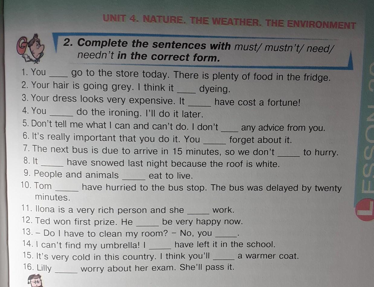 Різниця між дієсловами need та must полягає в тому, що need ми використовуємо тоді, коли людині потрібно щось зробити, але це не обов'язково, тому вона може цього і не робити, в той час як must ми вживаємо тоді, коли йдеться про обов'язок, наказ, правило.