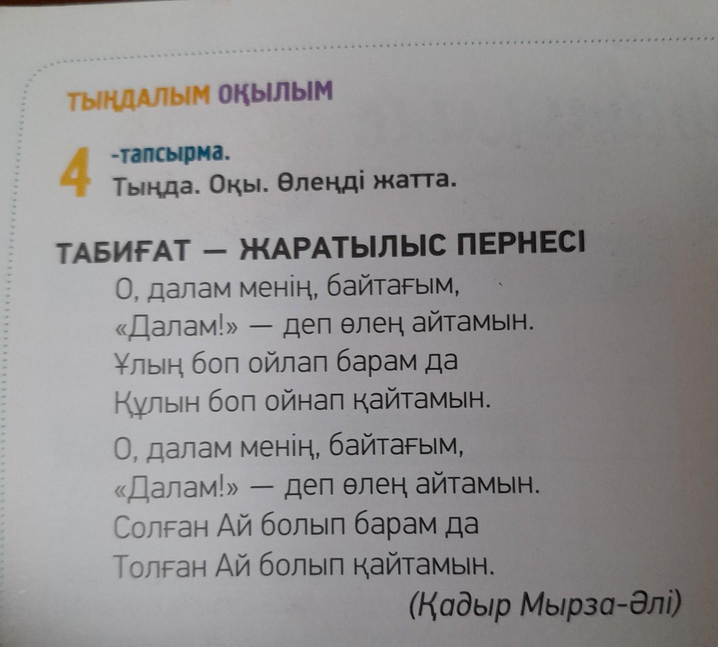 ТЫҢДАЛЫМ ОҚЫЛЫМ 4 -тапсырма. Тыңда. Оқы. Өлеңді жатта. — - ТАБИҒАТ – ЖАРАТЫЛЫС ПЕРНЕСІ О, далам менің, байтағым, «Далам!» деп өлең айтамын. Ұлың боп ойлап барам да Құлын боп ойнап қайтамын. О, далам менің, байтағым, «Далам!» — деп өлең айтамын. Солған Ай болып барам да Толған Ай болып қайтамын. (Қадыр Мырза-Әлі) перевод пж срочно переводчик нормально не переводит пж помогите