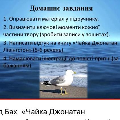 3.(Пишу на руско украинском так что читай внимательно и исправляй ошибки) Повисть Чайка Джонатан Лингвистон дуже гарна. Там розказывается про чайку которая не смотря ни на что ишла к своей мечте. Его выгнали из зграи за то что он был не такой как все. Он хотел научиться летать как можно лучше а другие чайки хотели просто добыть себе еды и прожить день. У Джонатона не всегда получалось хорошо летать потому-что он часто падал. Со временем он понял что что-бы летать не нужны длинные крылья а нужны короткие. Благодаря этой повести я понял что нужно отстаивать свое мнение, не всегда нужно прислушиваться к мнению общества и не нужно злиться на них, потому-что не все готовы сделать ради тебя то, что ты готов сделать ради них.