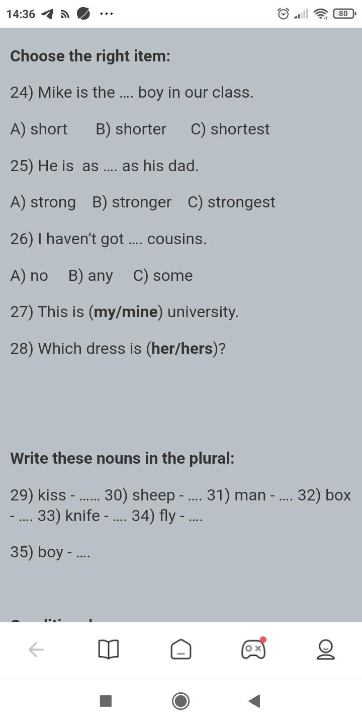 24)C 25)A 26)B 27)my 28)hers 29)kisses 30)sheep 31)men 32)boxes 33)knifeses 34)flies 35)boys